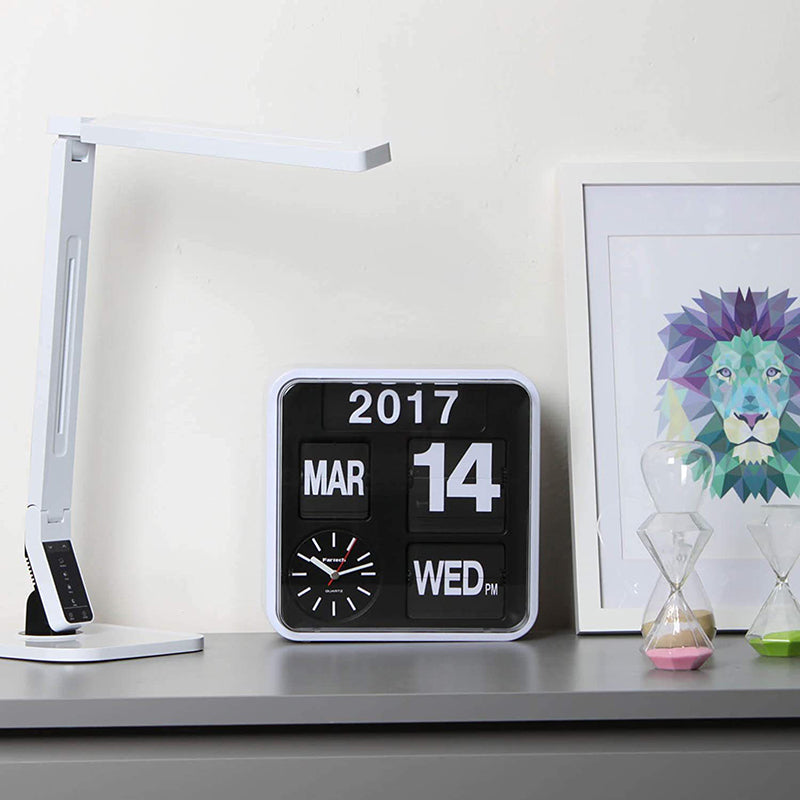 Bring clear, at-a-glance time and a full flip calendar to your space. This square flip clock features large numerals, silent quartz movement, and an auto-flip display for year, month, date, and day of week. Use it on a desk or hang it on the wall.