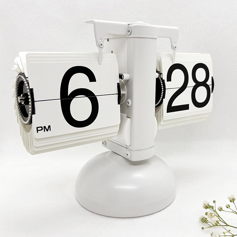 A minimalist white flip desk clock with a silent auto-flip mechanism, large easy-read numerals, and 5-second setup. Crafted with ABS housing, 304 stainless-steel accents, and durable PVC flip cards—a modern, battery-powered statement for your desk, shelf, or bedside.